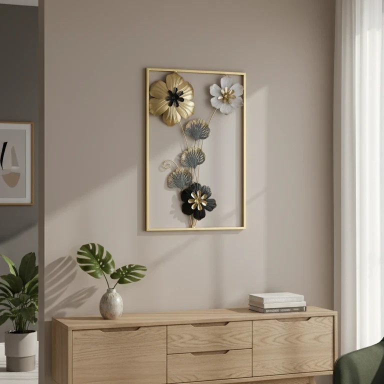 Elevate your interior space with this striking Modern Vertical Multi-Floral Metal Wall Art. This beautifully designed piece features an intricate arrangement of blooming flowers and delicate leaves, all framed within a sleek golden border to create a captivating visual statement.