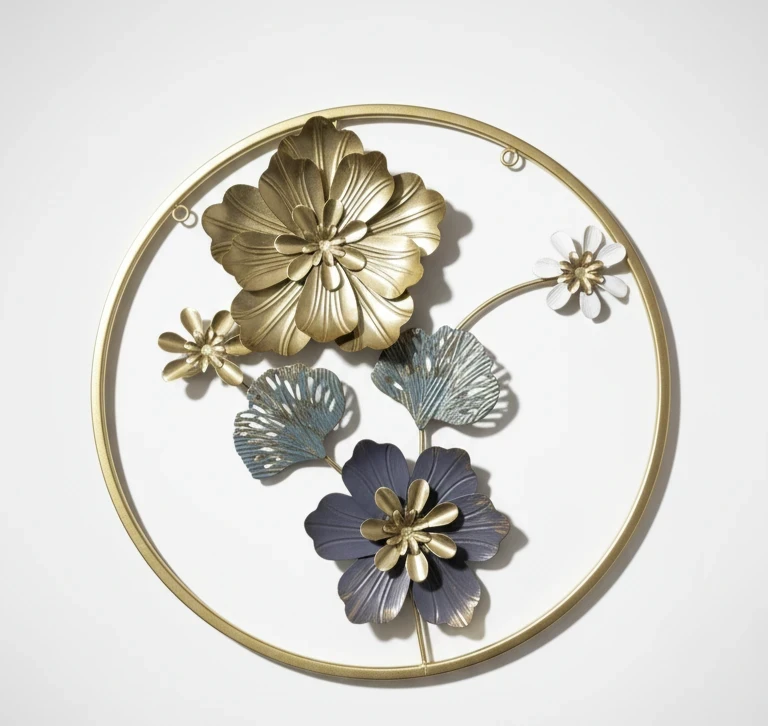 Introduce a touch of contemporary elegance and artistic flair to your home with this stunning Modern Round 3D Floral Metal Wall Art. This captivating piece features an asymmetrical arrangement of dimensional flowers and leaves, all gracefully framed within a sleek golden circle.
