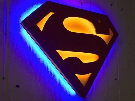 Experience the power of the Man of Steel with this spectacular backlit wooden Superman logo. This isn't just a sign; it's a piece of art that illuminates your space with an incredible dual-light effect. The iconic "S" shield is cut from wood and finished in matte black. Inside, a warm yellow/orange light gives the classic emblem its heroic glow. Surrounding the whole piece is a vibrant blue backlighting that casts a brilliant, Kryptonian-inspired halo onto your wall. Measuring a commanding 32" wide x 9" high, it's the ultimate collectible for any DC or superhero enthusiast.