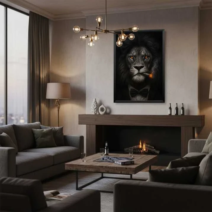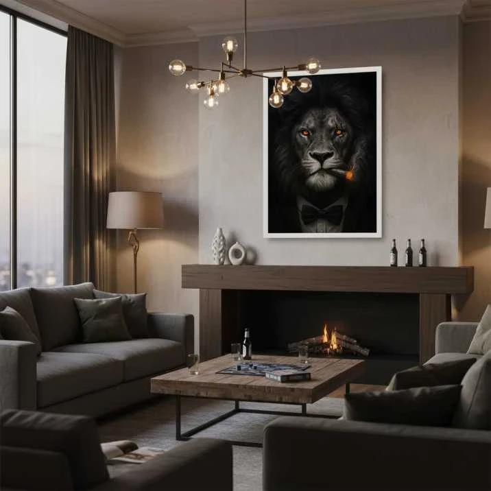 This striking art print captures the powerful presence of a lion with a bold, contemporary attitude. The majestic animal is portrayed with an air of confidence, his fiery, intelligent eyes glowing against a dark background as he wears a modern suit and tie. This piece is a symbol of courage, leadership, and quiet strength, making it a perfect statement for a living room, office, or study. The dramatic lighting and rich detail create a compelling focal point that is both sophisticated and commanding.