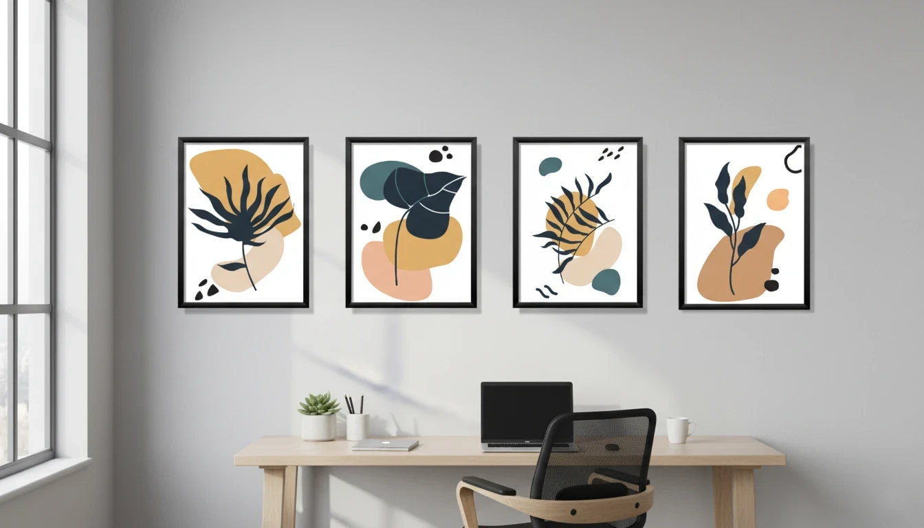 This set of four minimalist art prints brings a touch of modern, organic elegance to any space. Each piece features a unique, abstract botanical design with flowing, natural shapes in a calming palette of earthy tones, including mustard, teal, and blush. The clean lines and serene colors make this collection a perfect addition to a living room, bedroom, or office, creating a peaceful and sophisticated atmosphere. Available Sizes: • A1: 20x30 inches • A2: 16x24 inches • A3: 12x18 inches • A4: 9x12 inches Materials • Frame: High-quality PVC • Paper: Luster • Front: Transparent Acrylic Glass • Back: 3.18mm hardboard wood • Hooks: Pre-installed for easy hanging Packaging Each frame is carefully protected with bubble wrap to prevent scratches and then secured in a sturdy cardboard box, ensuring it arrives at your door in perfect condition.