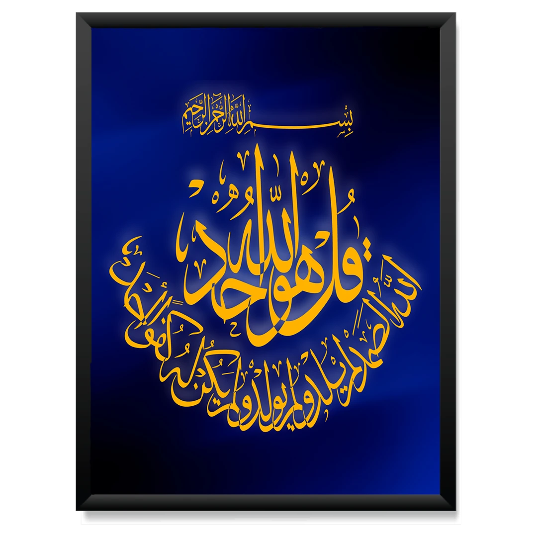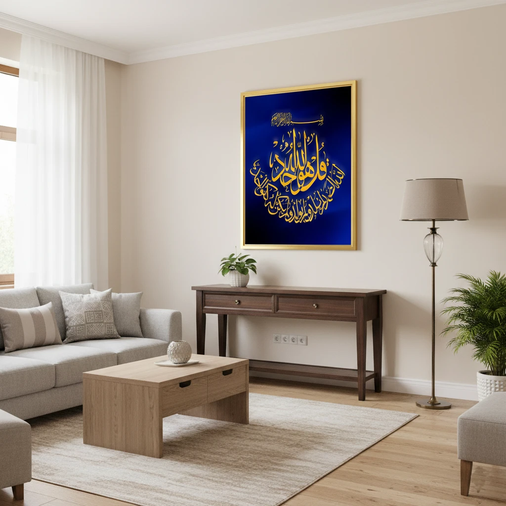 This breathtaking art print features the complete text of Surah Al-Ikhlas (Chapter of Sincerity) from the Quran, rendered in a magnificent, glowing calligraphic style. The brilliant golden-yellow script appears to radiate light against a deep, vibrant royal blue background, creating a profound and luxurious spiritual focal point. This piece is perfect for adding elegance, reverence, and a daily reminder of faith to a living room, prayer space, or entryway.