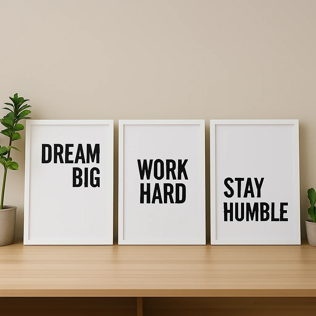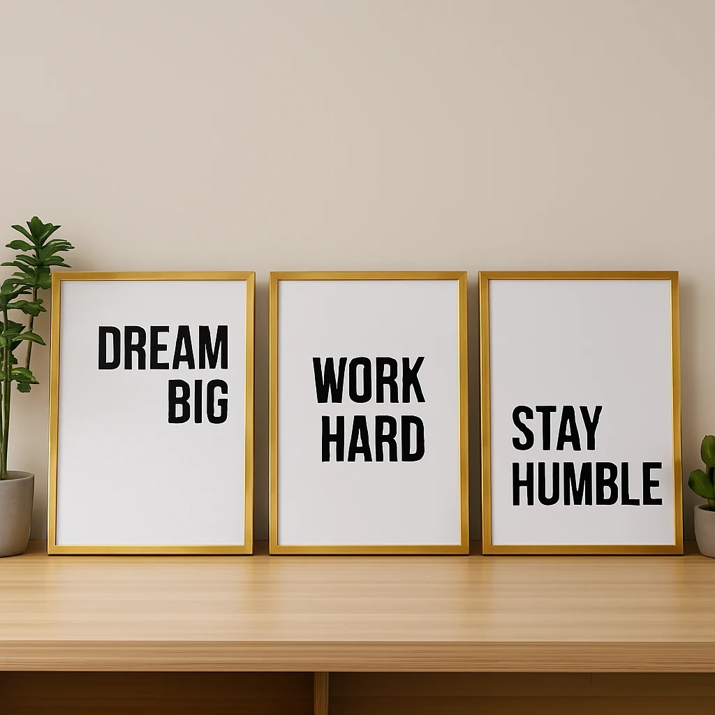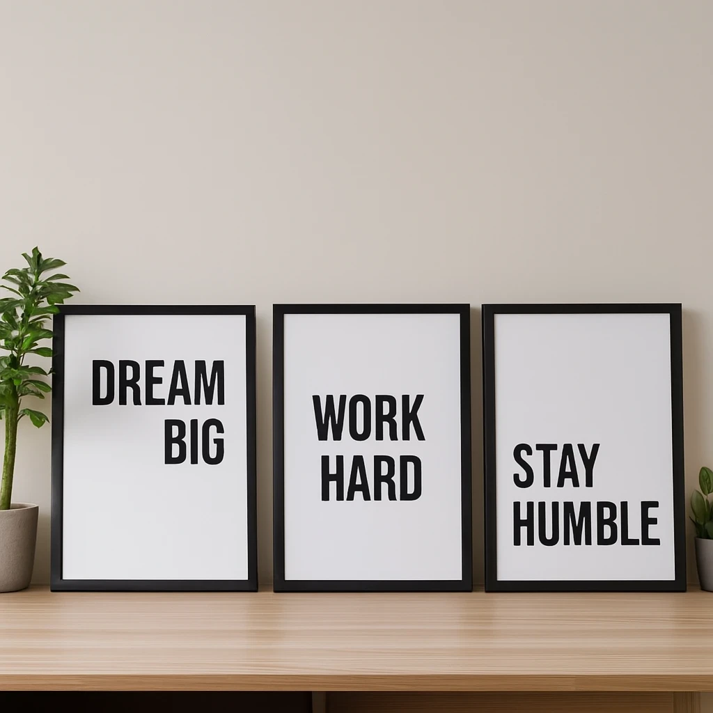 This set of three minimalist art prints is designed to be a daily source of inspiration for your office, bedroom, or living space. Featuring the bold, clean phrases "DREAM BIG," "WORK HARD," and "STAY HUMBLE," this collection combines a simple aesthetic with a powerful message. The striking black-and-white design ensures these prints complement any decor, serving as a constant reminder of the keys to success.
