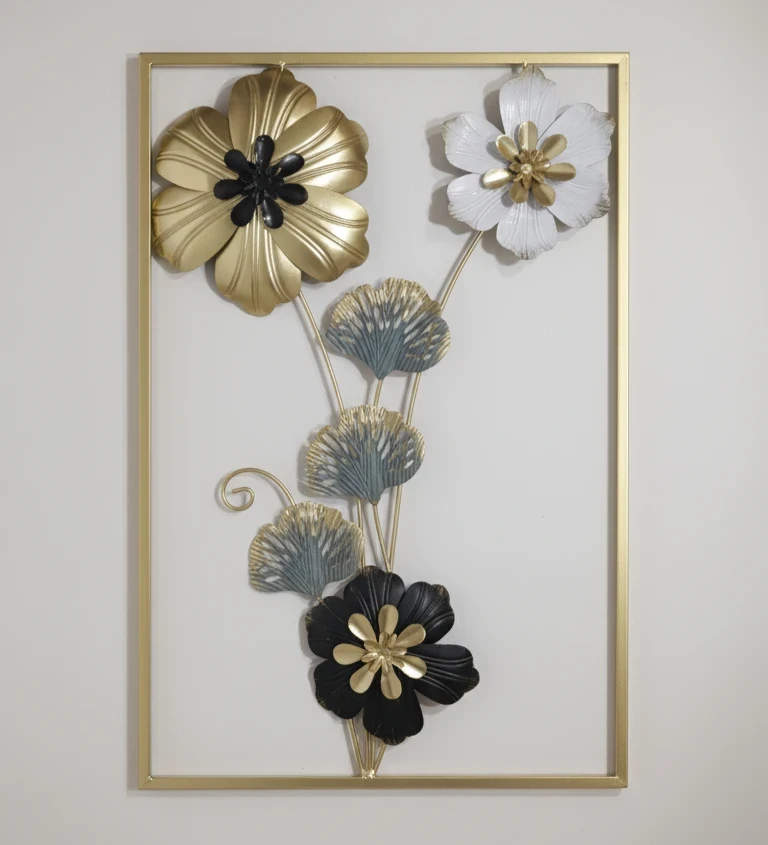 Elevate your interior space with this striking Modern Vertical Multi-Floral Metal Wall Art. This beautifully designed piece features an intricate arrangement of blooming flowers and delicate leaves, all framed within a sleek golden border to create a captivating visual statement.