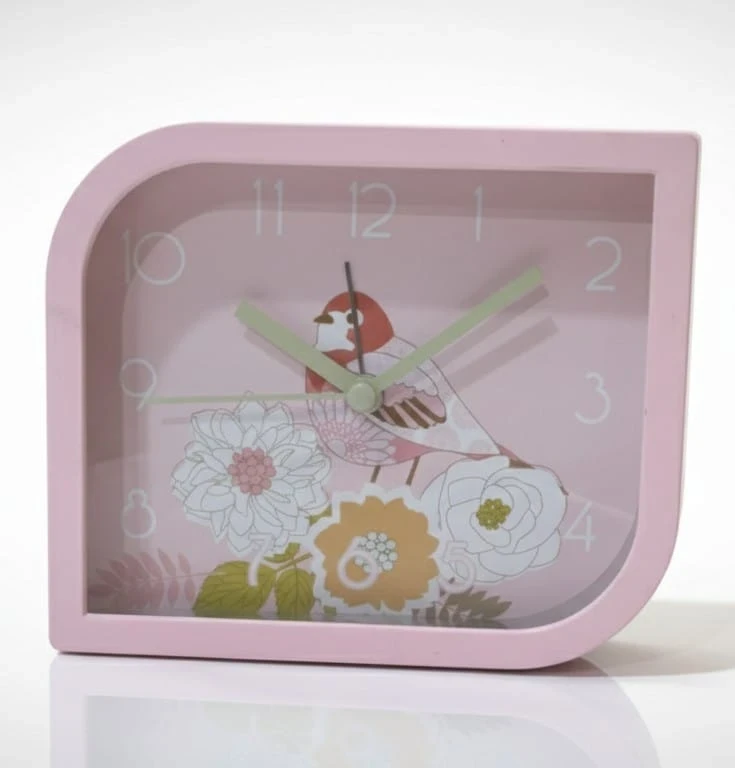 Wake up to a touch of springtime charm with this delightful Table Alarm Clock. Encased in a soft pink plastic frame, the clock face features a beautiful, stylized illustration of a sweet bird nestled among vibrant flowers. This artistic design, set against a complementary light pink background, makes the clock a lovely decorative accent for any nightstand, desk, or shelf. With clear numbering and bright, easy-to-read hands, this compact piece is a charming and functional way to keep track of time.