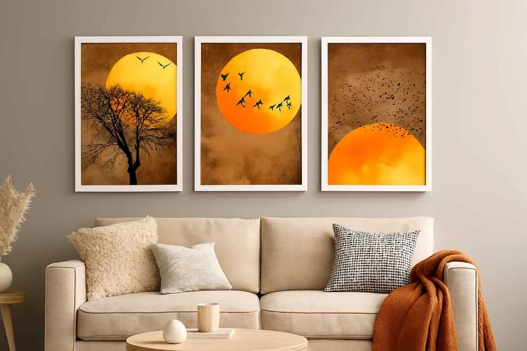 This stunning set of three art prints captures a serene sunset scene in a unique and captivating way. Each print combines to form a panoramic view of a large, glowing orange sun, silhouetted by a gnarled tree and a flock of birds taking flight. The warm, rustic tones and textured background create a sense of peaceful natural beauty, making this set a perfect addition to a living room, bedroom, or entryway.