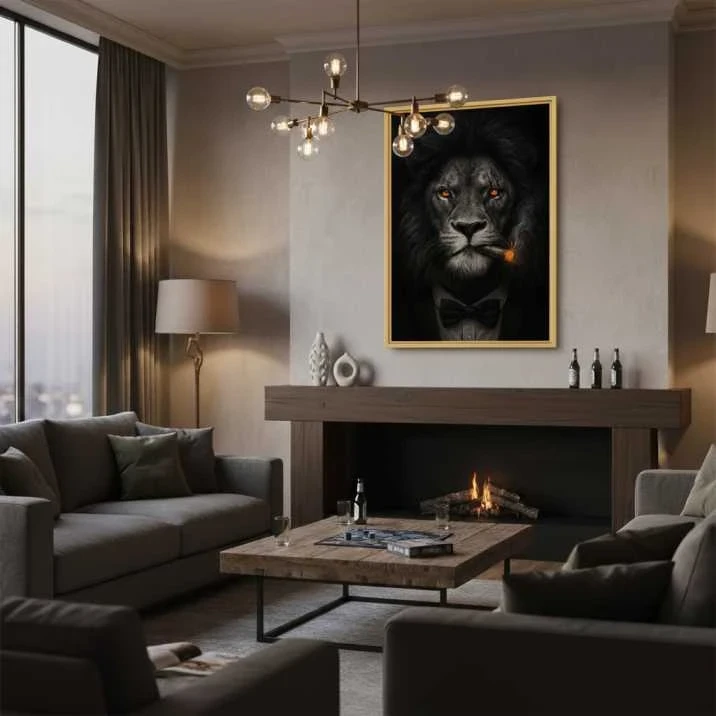 This striking art print captures the powerful presence of a lion with a bold, contemporary attitude. The majestic animal is portrayed with an air of confidence, his fiery, intelligent eyes glowing against a dark background as he wears a modern suit and tie. This piece is a symbol of courage, leadership, and quiet strength, making it a perfect statement for a living room, office, or study. The dramatic lighting and rich detail create a compelling focal point that is both sophisticated and commanding.